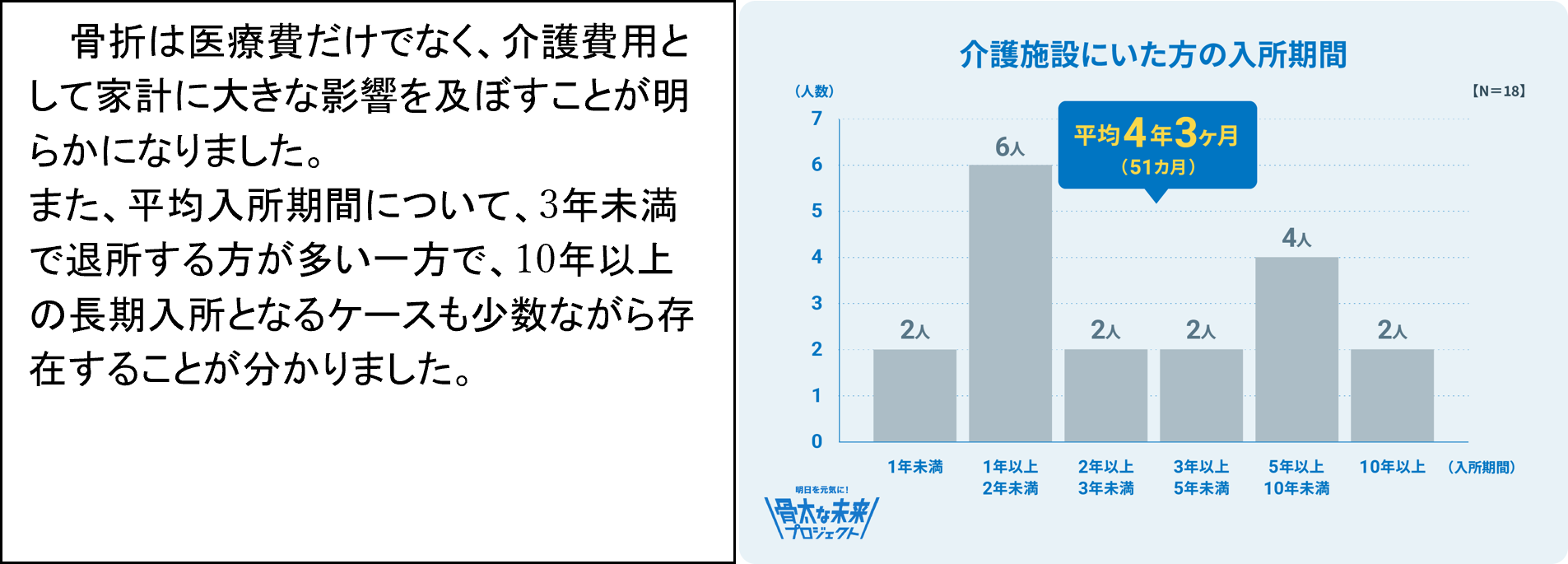 骨折により、やむを得ず介護施設に入所するケースがあります。今回の調査において、介護施設に入所した方の平均入所期間は51ヵ月(4年3ヵ月)であることがわかりました。