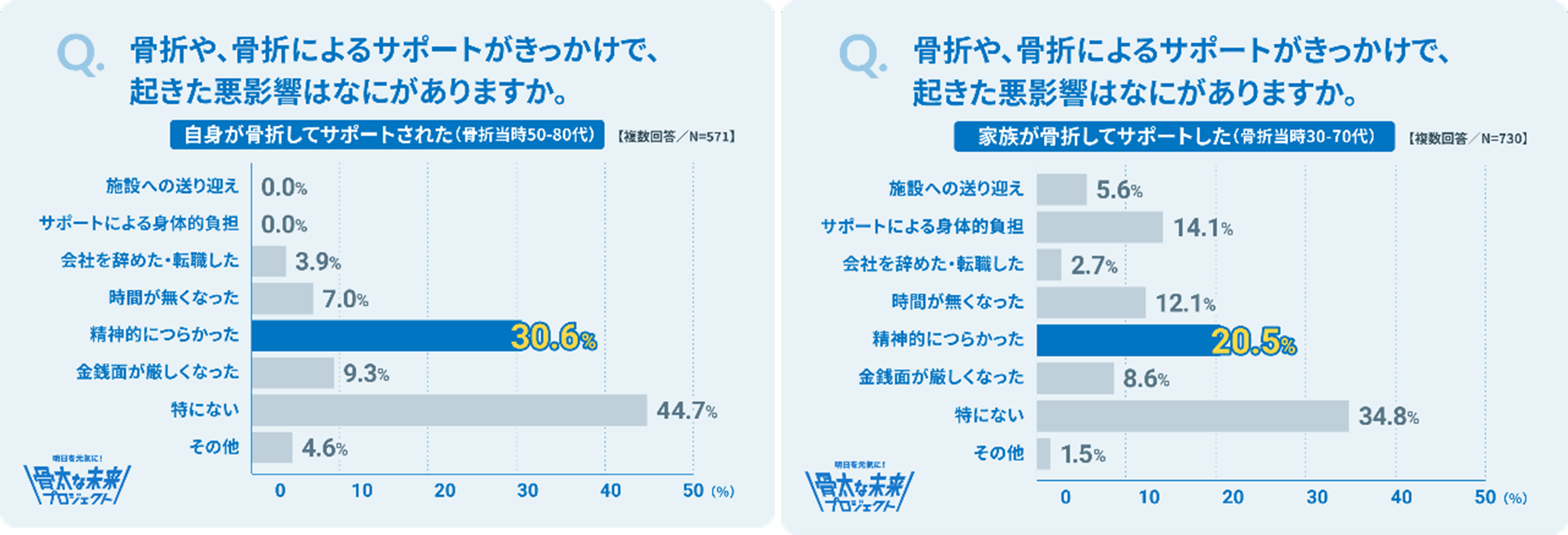 骨折は費用だけでなく、精神的負担もあることが今回の調査で明らかになりました。「骨折や、そのサポートが引き起こす悪影響は何か」との質問に対し、骨折を経験してサポートを受けた人の3割以上が「精神的に辛かった」と回答しました。また、サポートをした人も2割以上が同様に精神的負担を挙げています。