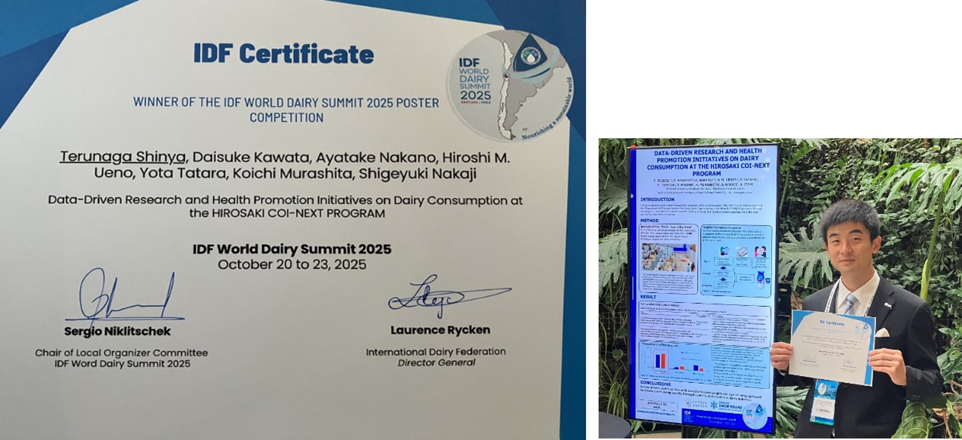 雪印メグミルク株式会社(本社:東京都新宿区 代表取締役社長:佐藤 雅俊)は、2025年10月20日~23日に国際酪農乳業連盟(IDF)主催「IDFワールドデーリーサミット2025(チリ・サンティアゴ)」において、弘前大学との共同研究講座「ミルク栄養学研究講座」の活動をまとめたポスター発表が健康と栄養の分野で優秀賞、さらに8つの分野の中から最も優秀な賞に贈られる「最優秀ポスター賞」を受賞いたしました。