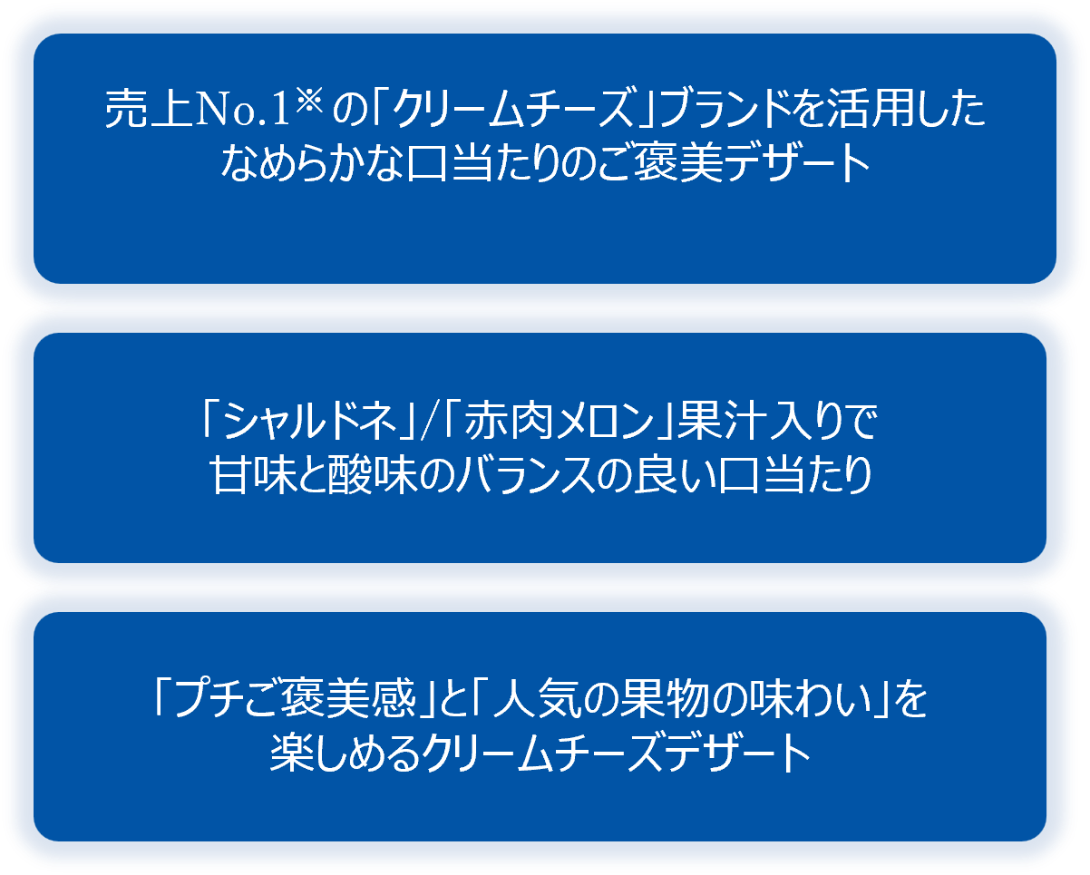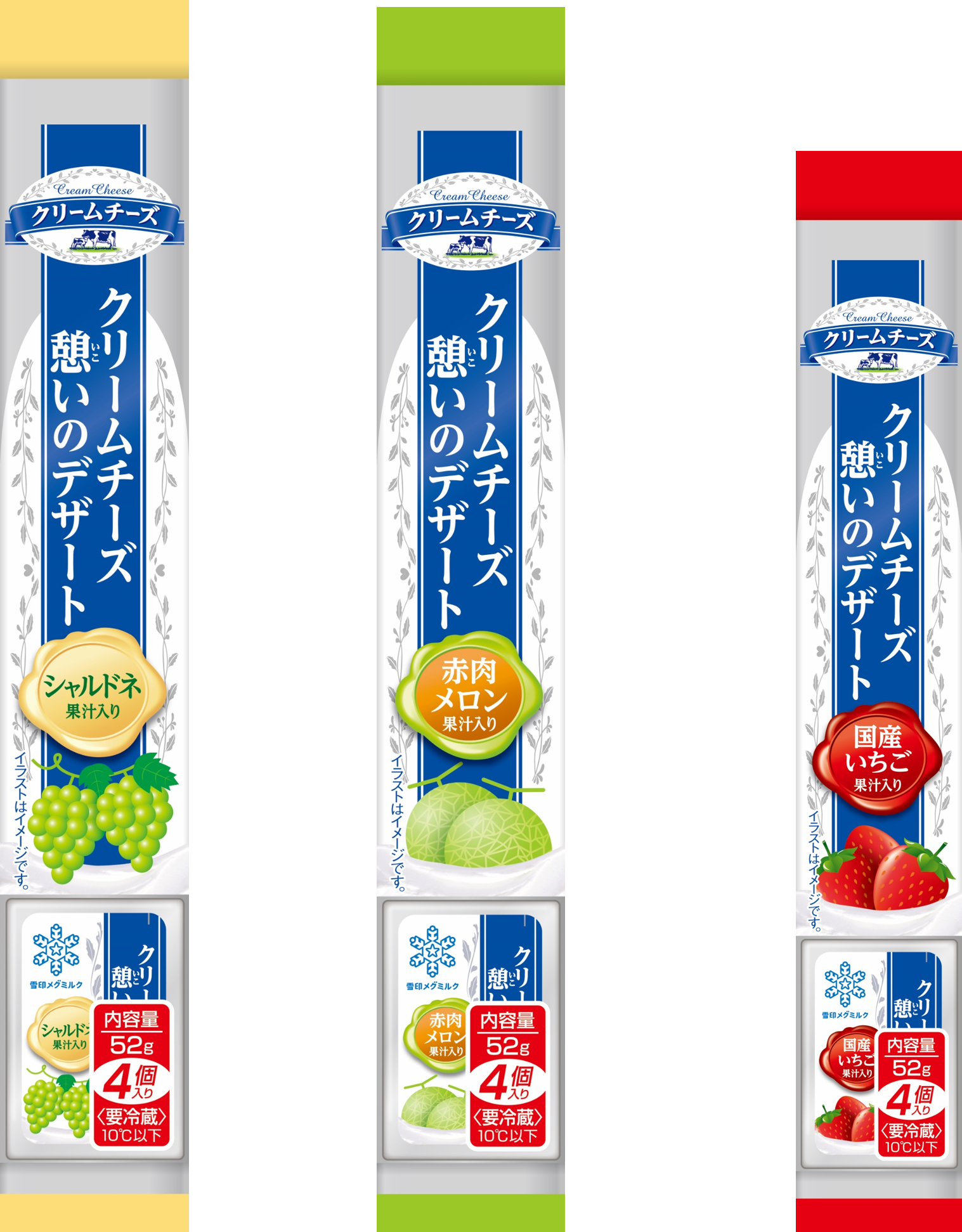 「クリームチーズ憩いのデザート」シリーズは、クリームチーズ市場で売上No.1※の当社「クリームチーズ」と同じクリームチーズ原料を使用した、なめらかな口当たりのご褒美デザートです。今回、新たにシャルドネ果汁入りと赤肉メロン果汁入りをラインナップに加え、「私だけのプチご褒美感」と「人気の果物の味わい」を楽しめるクリームチーズデザートを手ごろな価格で提供し、日常の小さな贅沢を提案します。