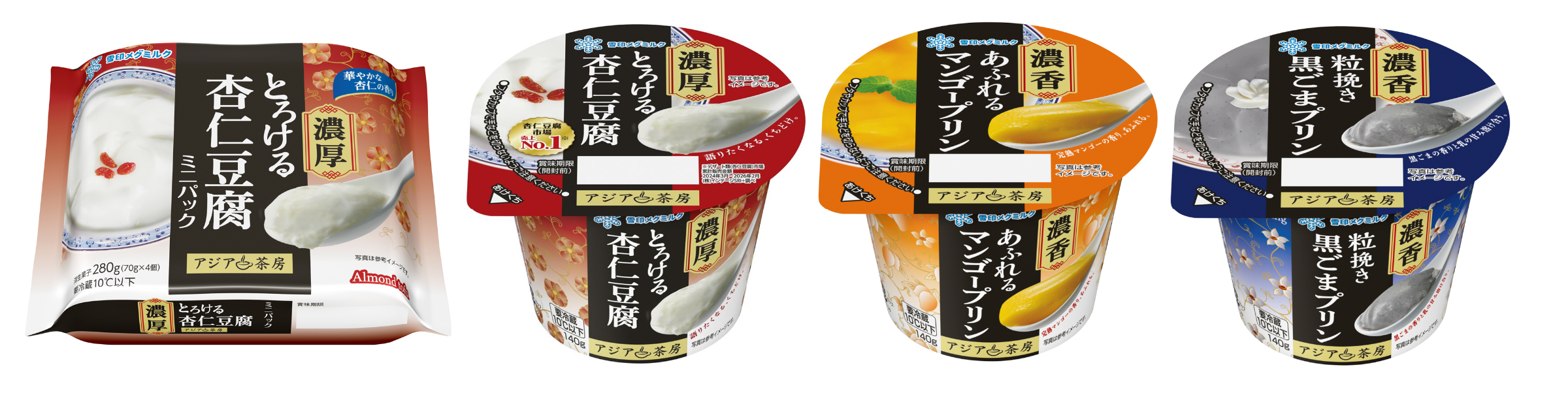 左から/「アジア茶房 濃厚とろける杏仁豆腐 ミニパック」新発売、「アジア茶房 濃厚とろける杏仁豆腐」リニューアル、「アジア茶房 濃香あふれるマンゴープリン」リニューアル、「アジア茶房 濃香粒挽き黒ごまプリン」リニューアル