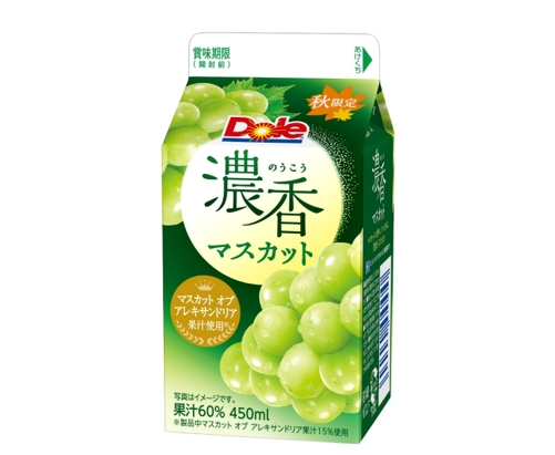 『DoleⓇ 濃香 マスカット』は、60%ぶどう果汁入り飲料で、白ぶどうをベースに、製品中に「マスカット オブ アレキサンドリア」果汁を15%使用し、マスカットの濃い香りが楽しめる「濃香」な仕立てとしました。