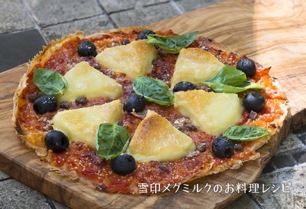 「6Pチーズ」は発売から六十年以上のロングセラー。そんなお馴染みのチーズをそのままのせて焼いたピザ。春巻きの皮を重ねて生地にしているので、パリパリっとした食感が楽しめます。トマトの酸味とアンチョビの風味、チーズのコクが絡み合い本格派の味です。