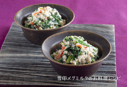 ほうれんそうは茹でて冷水にとる。水気をしぼり、食べやすい大きさに切る。 -