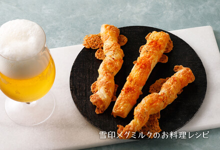 パイ生地は15分程室温で解凍し、少し曲がるくらいになったら打ち粉をして軽く伸ばし、8等分の棒状に切る。全体にフォークで4〜5回刺し穴をあける。