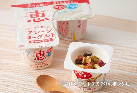 - 「ナチュレ 恵 megumi アレンジ楽しむプレーンヨーグルト」にドライフルーツ・ナッツをトッピングする。