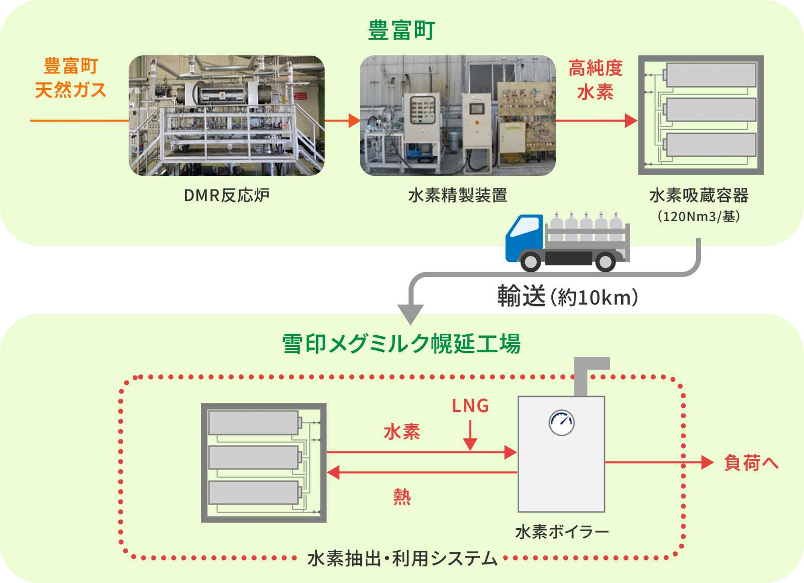 幌延工場では、2025年度下期より水素エネルギーの利活用による実証実験に取り組みます。近隣(豊富温泉)から産出された未利用ガスから創出された水素と既存ボイラ燃料であるLNGを混焼させ、ボイラ設備の燃料として使用します。