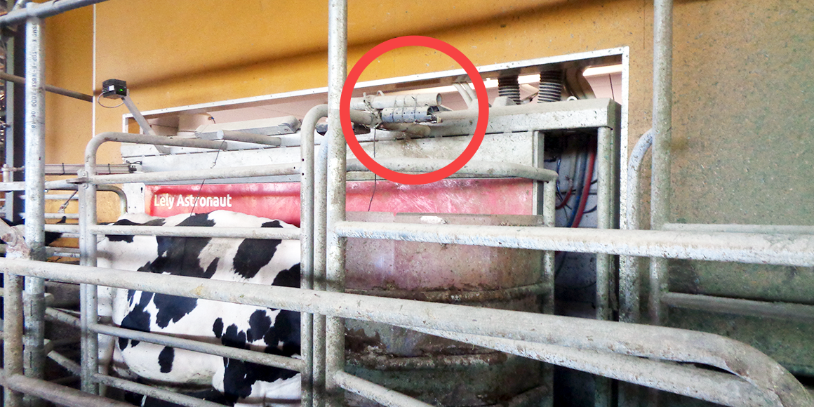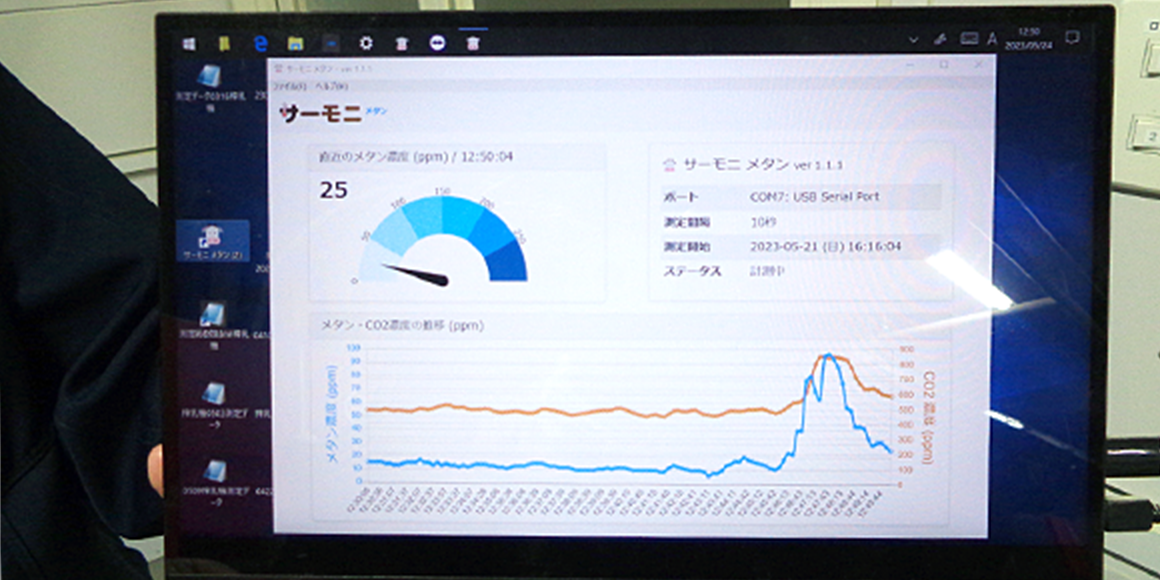 搾乳ロボットに設置した簡易メタンガスモニタリングシステム(赤丸の箇所)と計測データ収集の様子