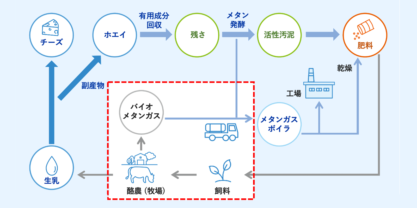 大樹工場では2023年5月よりホエイから有用成分を回収した残さをメタン発酵させ、バイオガスとして活用する取組みを進めています。2025年1月より、当工場で生成したバイオガスと、酪農家でふん尿処理時に発生したバイオメタンガスを混合させ、メタンガスボイラの燃料として利用する国内初の取組みを開始しました。