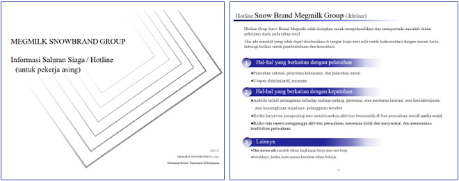 現在、雪印メグミルクグループではグリーバンスメカニズムの導入を検討しています。まず初めに、2023年11月、グループ内で雇用する外国人労働者向けの窓口を設けました。社内通報相談窓口「雪印メグホットライン」を活用し、インドネシア語、ベトナム語、中国語の翻訳機能を付与し、母国語での相談および回答を可能とする体制を整備しました。