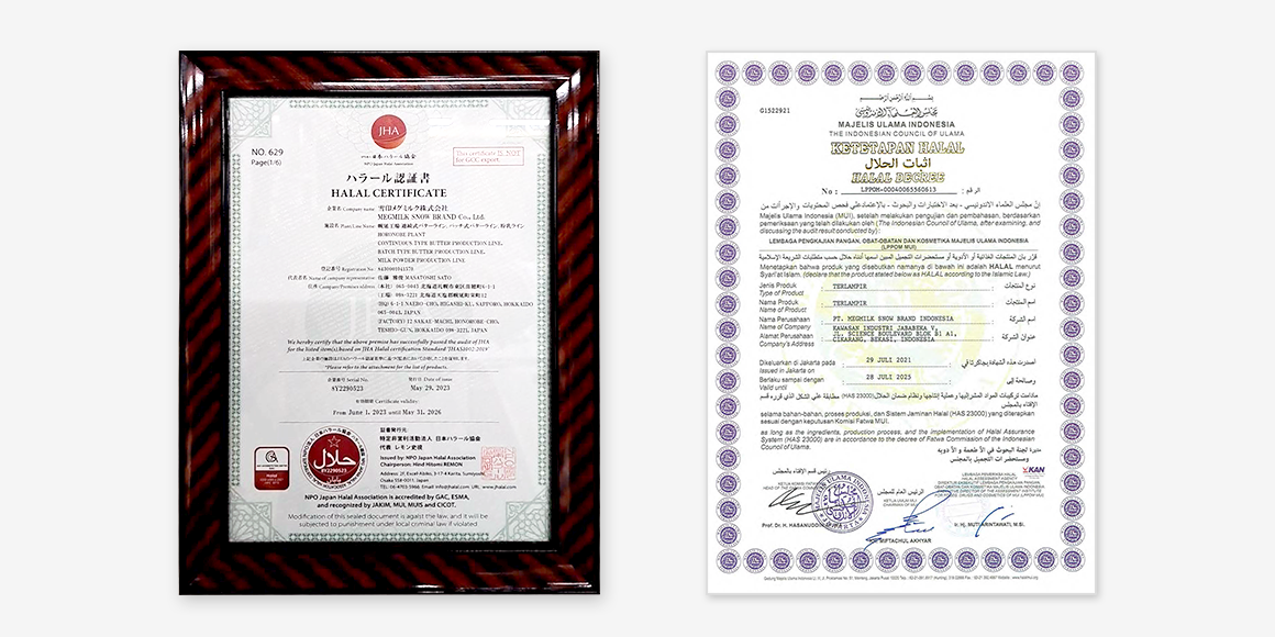 雪印メグミルクグループの海外の事業展開エリアには、インドネシアやマレーシア等、ムスリム(イスラーム教徒)が多く住む国や地域が含まれています。雪印メグミルク(株)幌延工場では、製造する業務用の脱脂粉乳、バターにて、イスラーム教徒の方々が安心して使用できる製品であることを示すハラール認証※1を取得しました。また、インドネシアで製造しているチーズを始め、マレーシア向けの粉ミルク等、様々な製品でハラール認証※2を取得しています。今後も宗教や生活スタイルに配慮したものづくりに取り組み、拡大するハラールマーケットを通じ、アジア地域での販売強化を推進していきます。