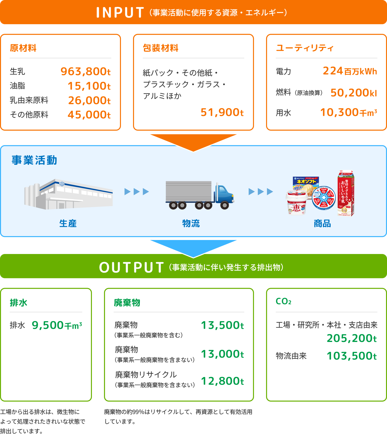 事業活動に伴う環境負荷の状況を把握し、使用するエネルギーや水などの資源を効率的に使用し、原材料や包装材料などは環境にやさしいものを開発するなどの取組みを推進しています。