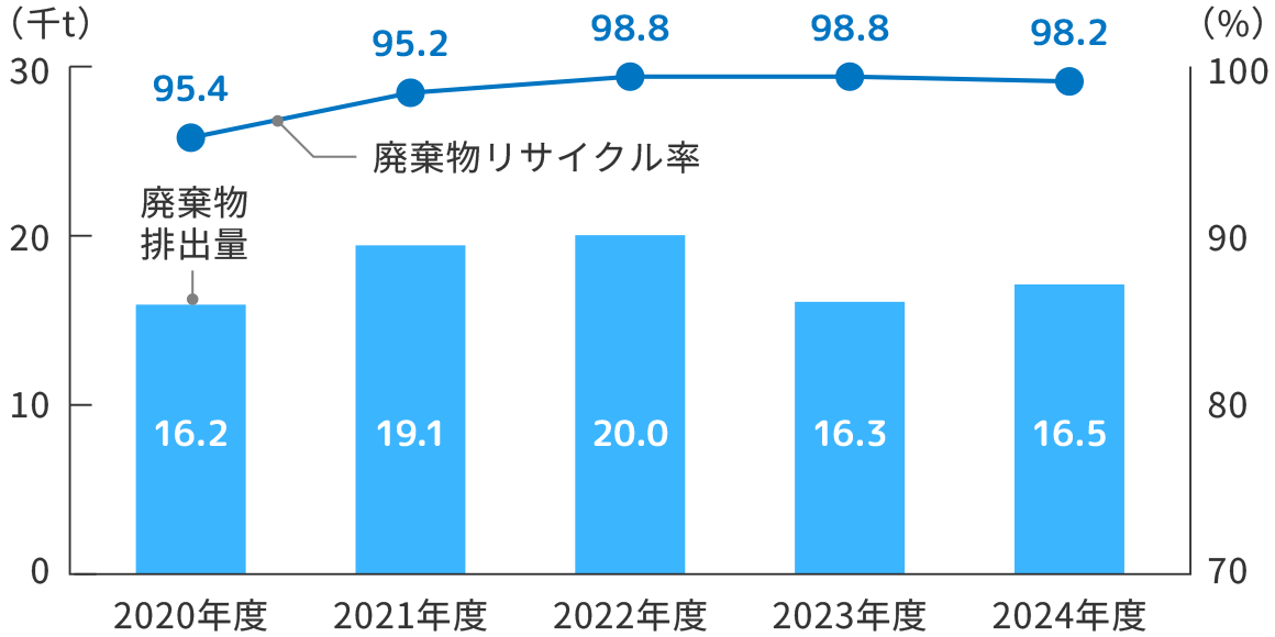 | 廃棄物リサイクル率98%以上を維持する。※1 | - | 98.2% | 2030年度 |