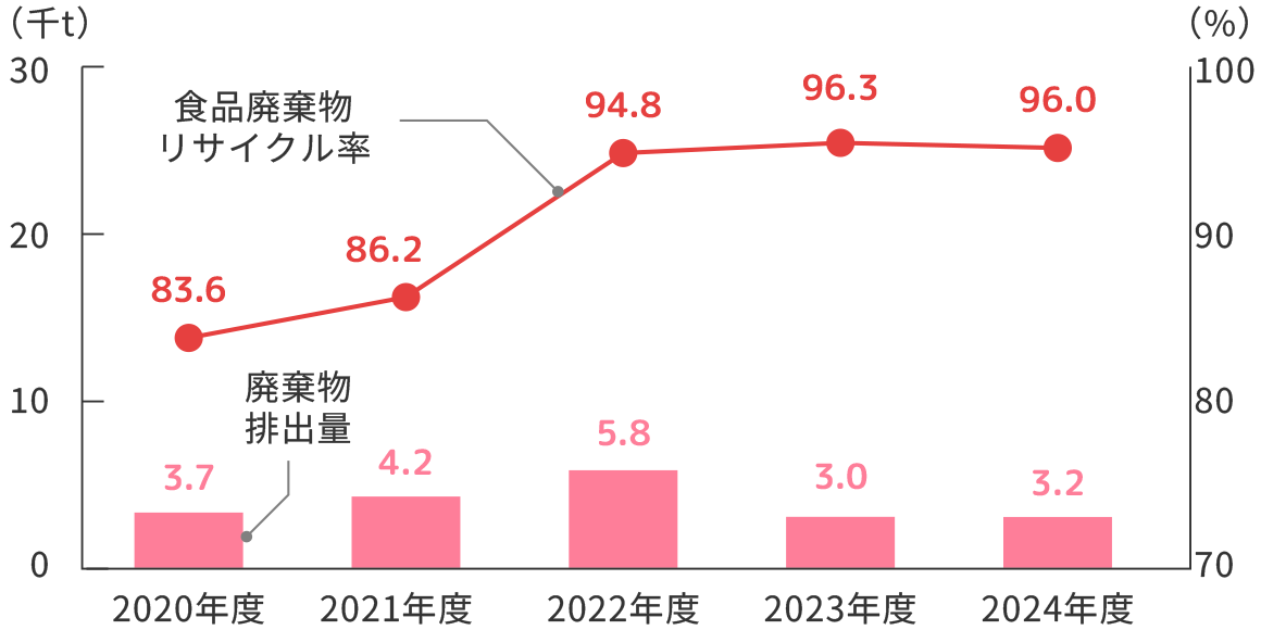 | 食品廃棄物リサイクル率を95%以上にする。※2 | - | 96.0% | 毎年 |