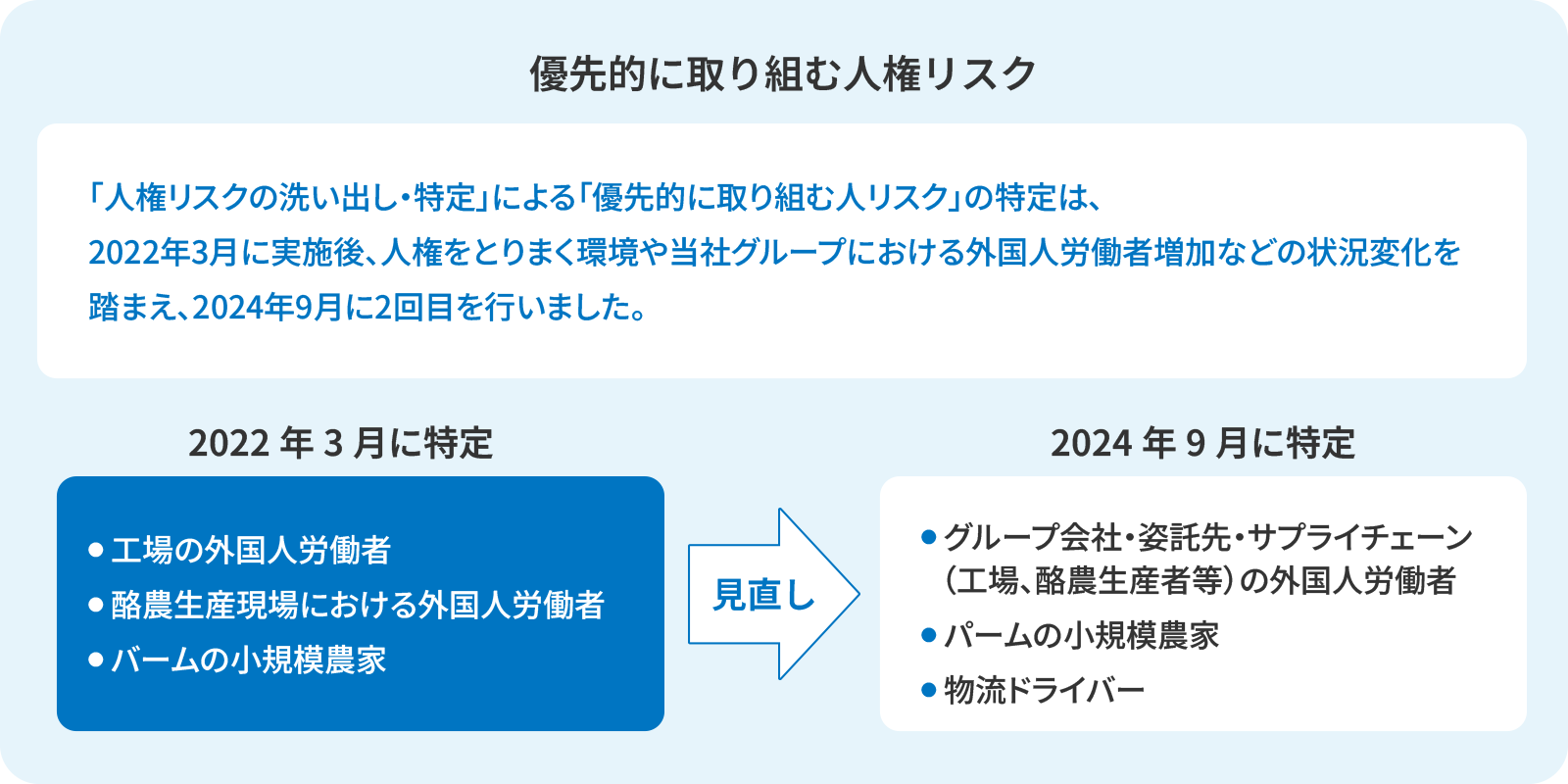 今後も、CRTをはじめとする人権関連有識者等のステークホルダーとのコミュニケーションを通して、「優先的に取り組む人権リスク」の定期的な見直しを行います。