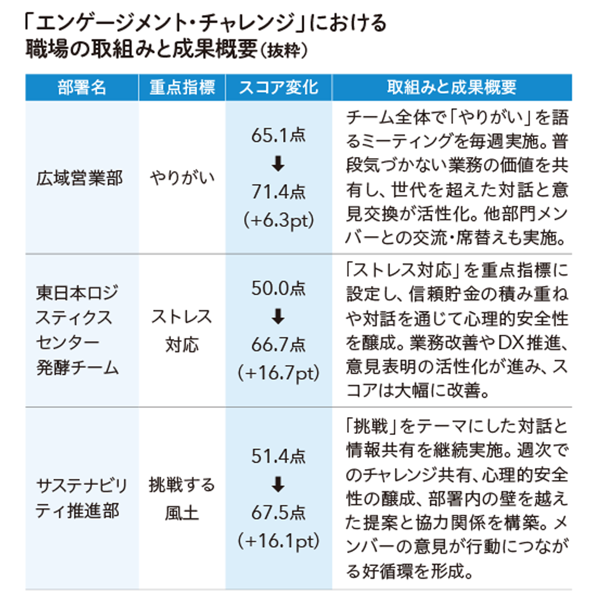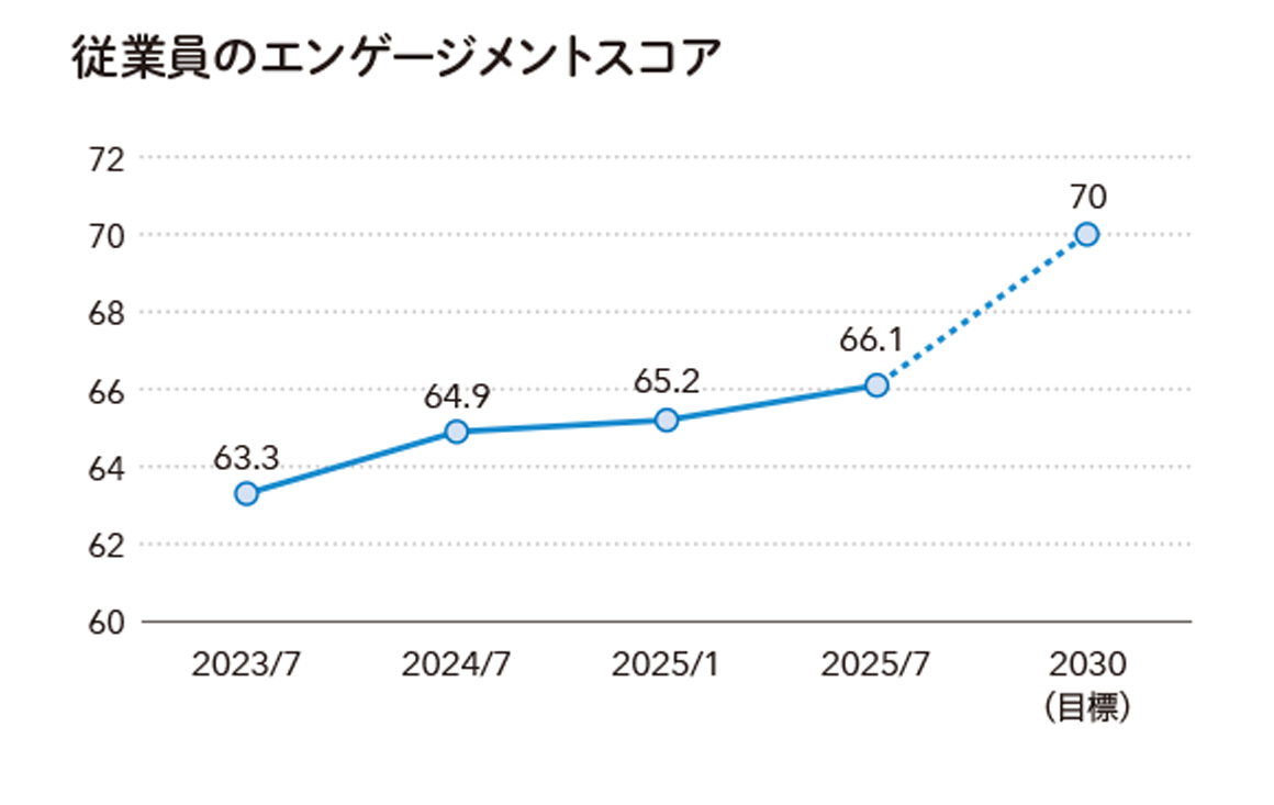 新経営計画「Next Design2030」では、エンゲージメントスコアの目標を70ポイントと設定し、進捗を役員の報酬決定要素に加え、経営職以上を対象とした心理的安全性セミナーを実施するなど、経営層による関与を強めることで、更なる向上に努めます。また、社内への水平展開を目的とした外部講師の支援による「エンゲージメント・チャレンジ」(モデルチーム活動)を導入し、有志8職場が6カ月間の改善活動に取り組み、参加した8職場すべてで重点指標のスコアが改善されました。